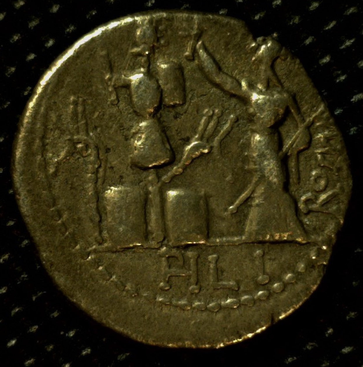 Roman Republic. M. Furlis L. F. Philus 119 B.C. AR Denarius. 3.75g. Head of Janus right. Rx: Roma standing, crowning trophy with wreath. Sear-156, Claw-281/1. VF+
