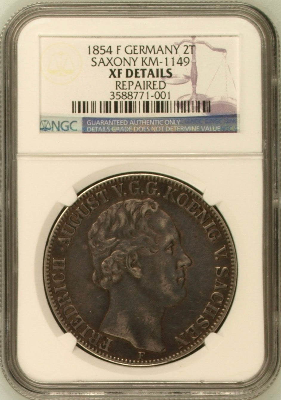 Germany, Saxony. 1854 F AR 2 Taler. KM-1149. NGC XF Details. Repaired.